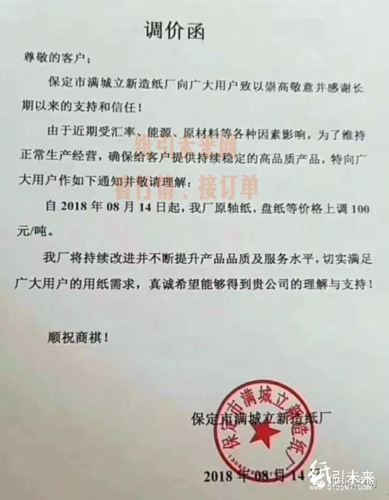 保定市嘉禾紙業:由于近期原材料價格上調,自2018年8月15日起,我公司原軸發貨價格在原有價格基礎上每噸上調100元。