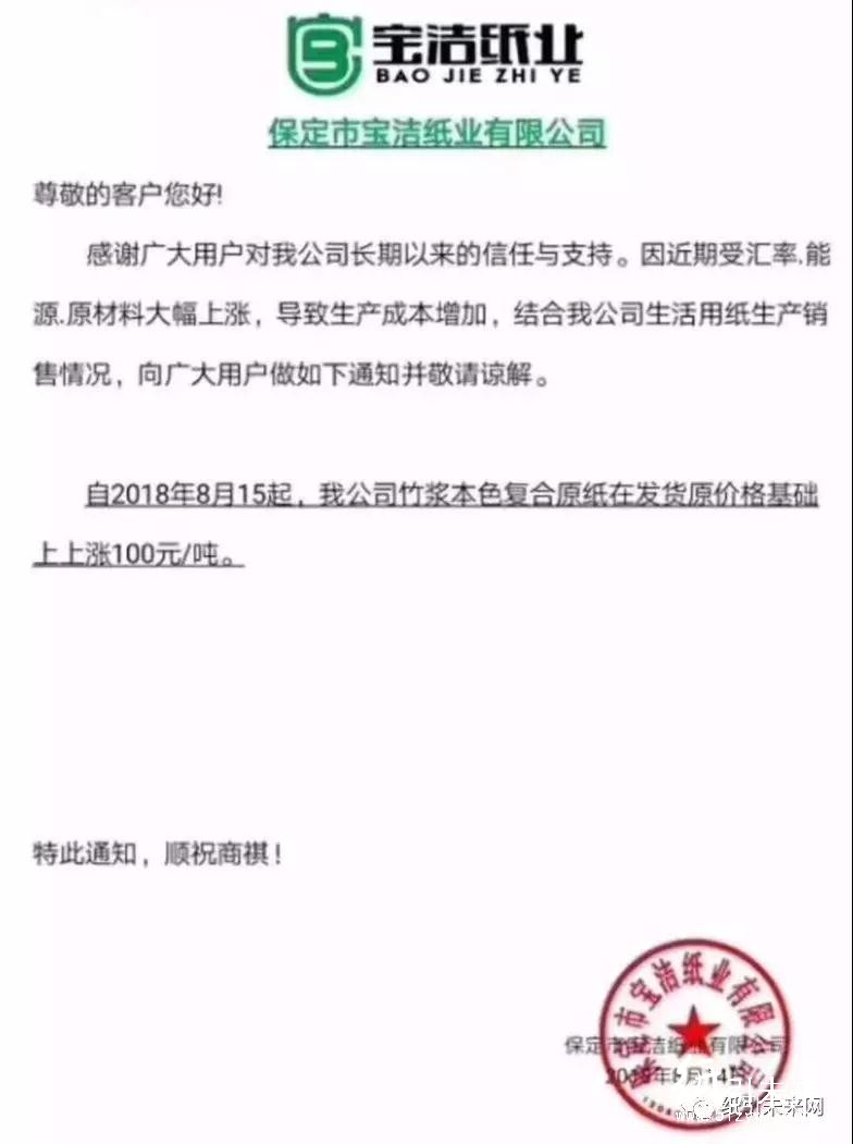 保定市寶潔紙業有限公司:因近期受匯率、能源、原材料等各種因素影響,自2018年8月15日起,我公司竹漿本色復合原紙在發貨原價格基礎上上漲100元/噸。