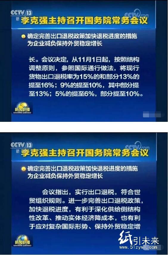 紙引未來網訊 中美貿易戰正朝著全面開打的趨勢前行,當下造紙等制造業和外貿出口業面臨前所未有的嚴峻的外部挑戰。而就在過去一周大家為祖國慶祝69周年之際,國家也悄悄出臺了兩條非常實在的好消息!第一條:10月7日,央行宣布下調存款準備金率一個百分點!第二條:10月8日,國務院確定完善出口退稅政策,加快退稅進度的措施,為企業減負,保持外貿穩定增長!