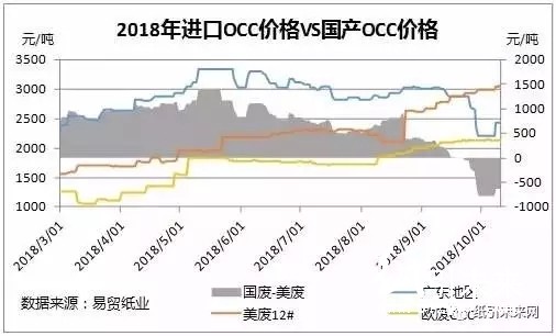從上圖中不難看出,在2018年8月份之前,進口廢紙相較于國產廢紙,價格優勢非常明顯。在很長的一段時間,美國廢紙較國產廢紙的價格優勢超過1000元/噸,并且美廢的得漿率要遠高于國產廢紙。這也造成了有進口批文的規模紙廠的生產成本要遠低于純國廢生產企業。然,美國廢紙的價格優勢,在9月份之后發生了迅速的反轉。9月、10月是一個比較特殊的時間節點,因進口批文不能跨年使用,以及美國廢紙進口檢驗嚴格,雙100%開箱,通關時間延長,國內買方都希望能夠盡快完成采購以及發貨。無論是對于歐廢還是美廢,在10月中旬之前完成發貨,年底之前完成通關都比較安全。所以在這樣的市場背景下,國外廢紙供應商價格較為堅持。雖然8月23號美廢加征關稅,但隨后其價格仍舊一路上揚,與疲軟的國內成品紙市場以及進入下行通道的國產廢紙形成了強烈對比。另外,加之人民幣貶值的繼續,促成了美廢OCC噸紙價格由低于國產廢紙,到比國產廢紙貴700元/噸的反轉。迅速反轉的局勢,是政策局勢以及市場雙重作用下的產物。但這樣的市場局面,整體可持續性較低。