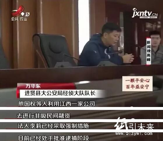 進(jìn)賢縣公安局經(jīng)偵大隊(duì)大隊(duì)長(zhǎng)萬(wàn)華東:熊國(guó)權(quán)等人利用江西一家公司,一家空殼公司皮包公司,去進(jìn)行非吸項(xiàng)目融資,這家公司是沒(méi)有金融牌照的沒(méi)有吸收公眾存款資質(zhì)的一家公司,我們對(duì)李莉,就是金來(lái)順,江西金來(lái)順公司,法人李莉已經(jīng)采取措施,現(xiàn)在已經(jīng)處于批準(zhǔn)逮捕階段。