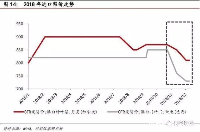 由于今年紙制品需求不旺,紙價價格下跌,企業盈利情況承壓導致開工率降低, 進而減少原材料需求,原材料出貨不暢,木漿庫存高企,導致了四季度開始降價走低。