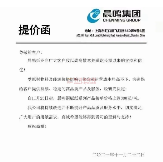 萬國紙業太陽白卡紙:自2021年11月25日起,我公司生產的全系列產品在目前執行價格基礎上統一漲價300元/噸。