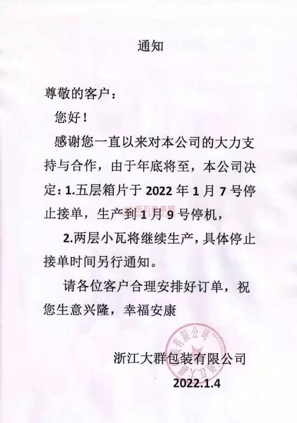 紙引未來(lái)網(wǎng)訊 2022年1月4日,一份包裝企業(yè)的通知函在業(yè)內(nèi)引起不小議論。該企業(yè)宣布,五層箱片于1月7日停止接單,生產(chǎn)到1月9日停機(jī);兩層小瓦將繼續(xù)生產(chǎn),具體停單時(shí)間另行通知。如無(wú)意外,這或許是業(yè)內(nèi)最早停止生產(chǎn)部分訂單的包裝企業(yè)。