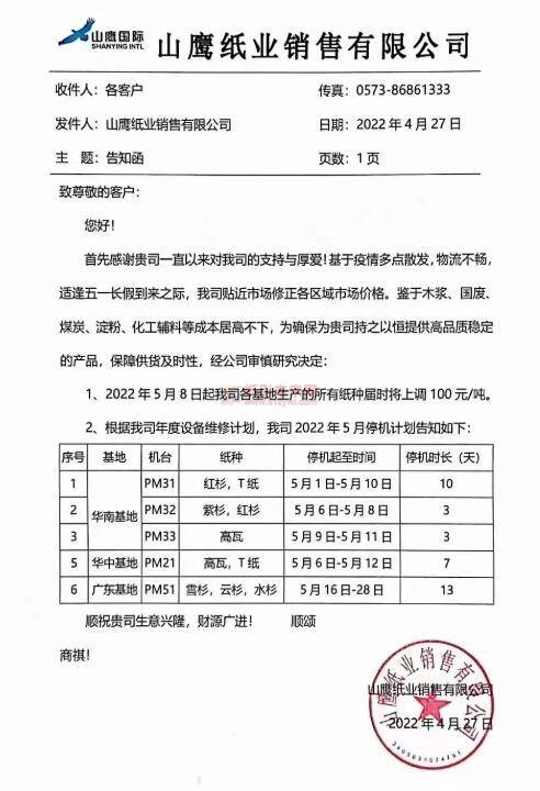 一份告知函,蘊(yùn)含漲價(jià)+停機(jī)兩項(xiàng)內(nèi)容,雖然罕見但卻并非個(gè)例。早在4月27日,山鷹國際就曾發(fā)布過一份“漲價(jià)+停機(jī)”告知函:5月8日起,各基地生產(chǎn)的所有紙種將上調(diào)100元/噸;華南、華中、廣東三大基地的5臺(tái)紙機(jī)將在5月1日-5月28日各停機(jī)3-13天。