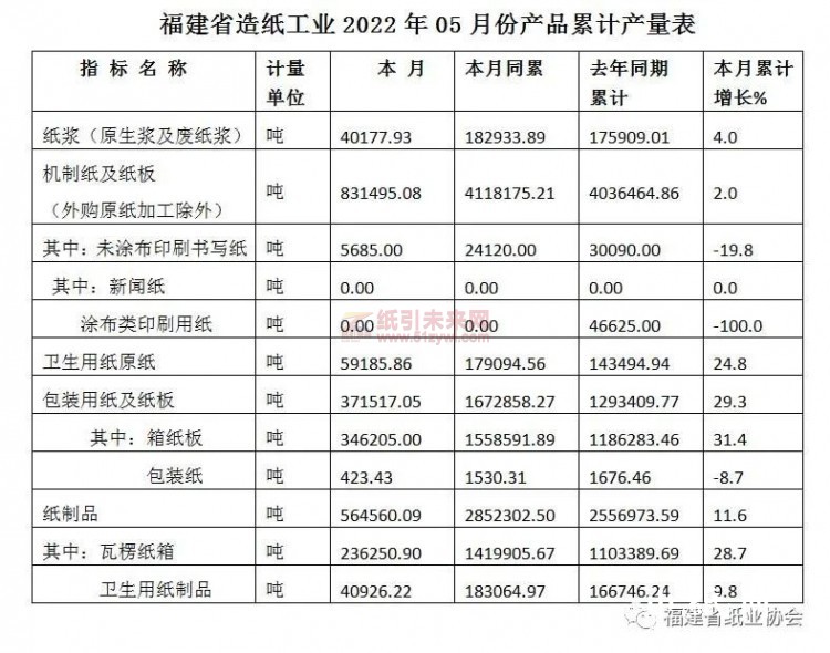 福建省造紙工業2022年05月份產品累計產量、產銷及出口情況表