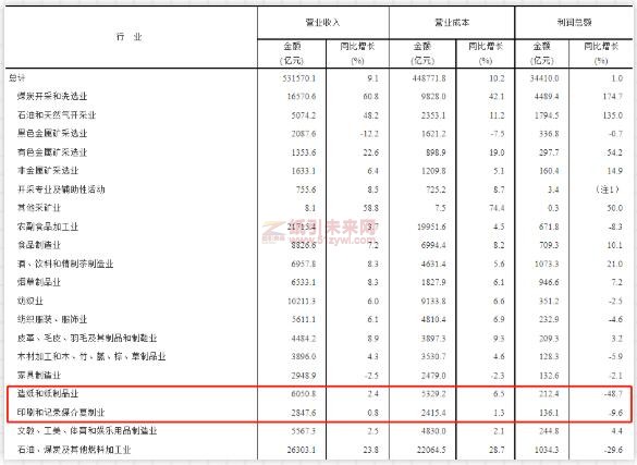 值得關注的是,造紙和紙制品業實現營業收入6050.8億元,同比增長2.4%;利潤總額212.4億元,同比下降48.7%。印刷和記錄媒介復制業實現營業收入2847.6億元,同比增長0.8%;利潤總額136.1億元,同比下降9.6%。