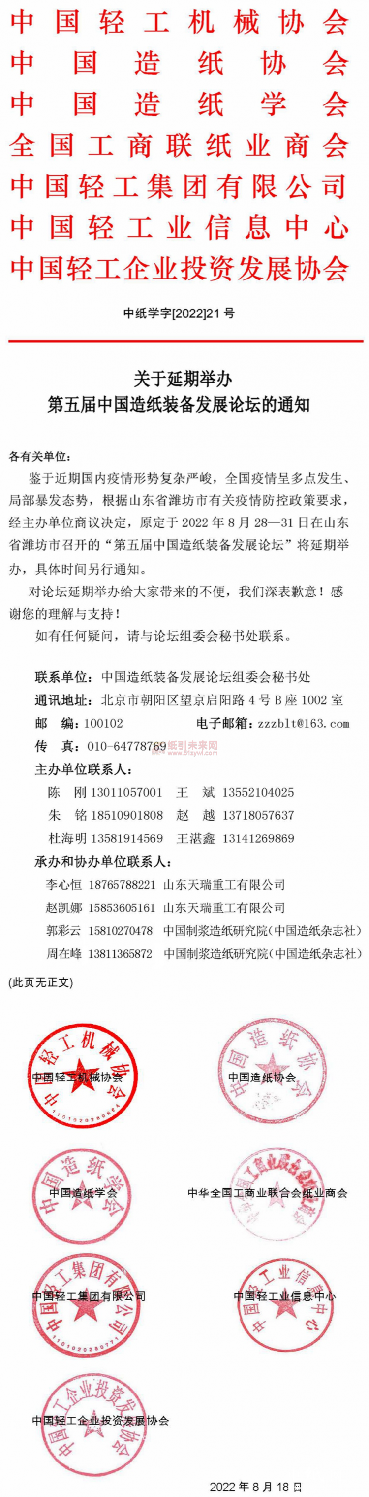 關于延期舉辦第五屆中國造紙裝備發展論壇的通知