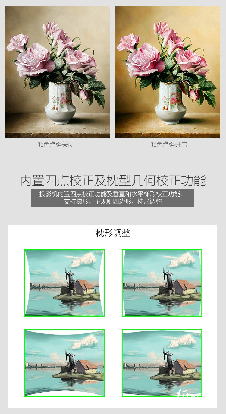 ◆垂直/水平梯形校正,四點和枕形校正;支持網絡無線投影,支持IOS無線投影;