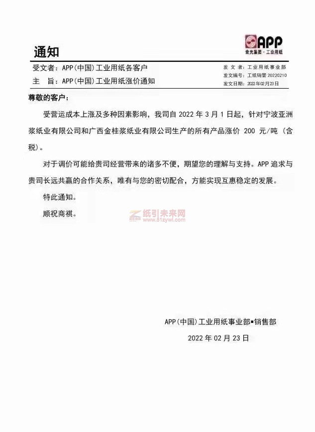 APP(中國)工業(yè)用紙事業(yè)部■銷售部:受營運(yùn)成本上漲及多種因素影響,我司自2022年3月1日起,針對(duì)寧波亞洲漿紙業(yè)有限公司和廣西金桂漿紙業(yè)有限公司生產(chǎn)的所有產(chǎn)品漲價(jià)200元/噸(含稅)。