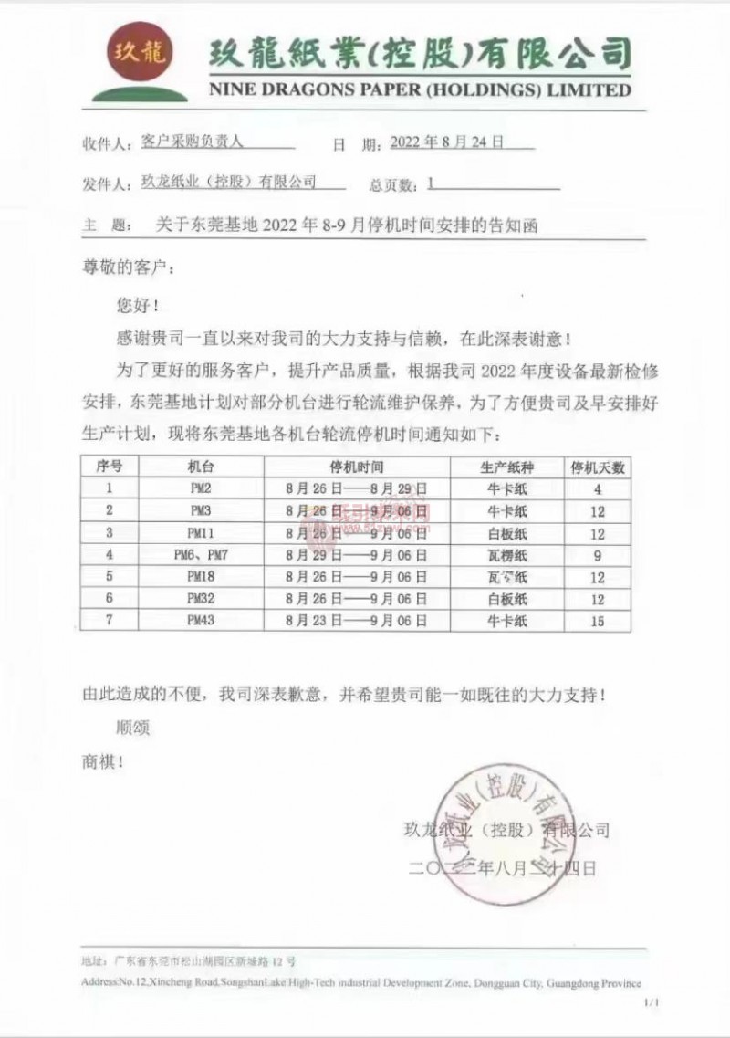 其它說明   8月24日廣東東莞玖龍停機(jī)檢修通知